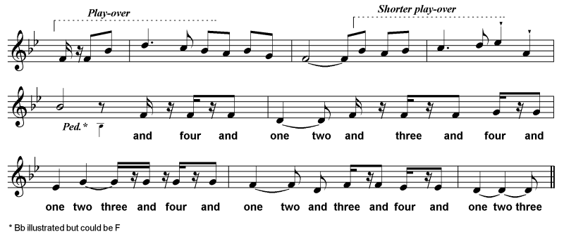 1. Your playover does NOT have to consist of the first two lines! Use any part of the tune so long as it is recognisable! Here the refrain is equally as good, and by bringing the playover to the end of the refrain it is obvious that the verse is about to start.